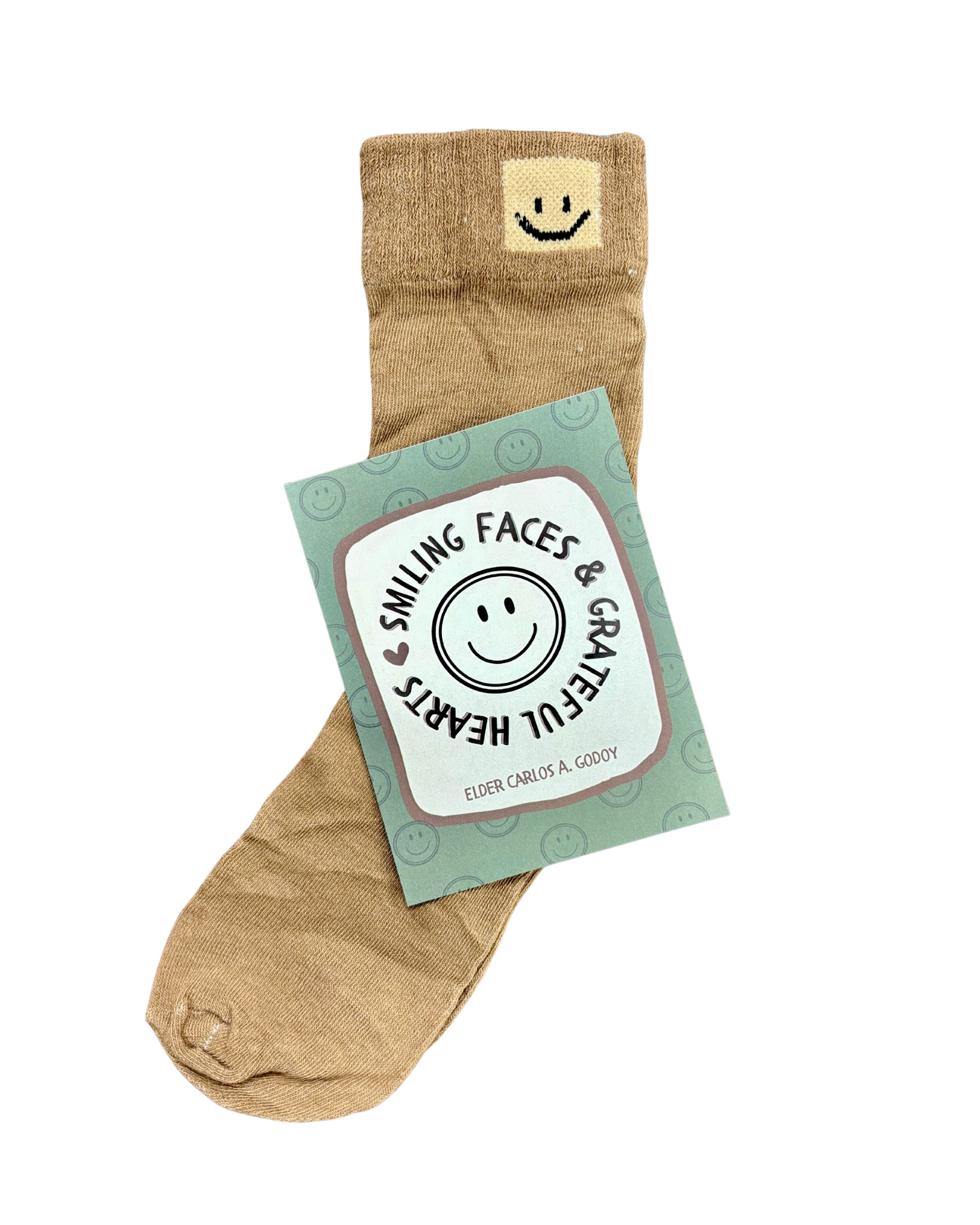 Each gift comes with one pair of smiley face socks (assorted colors: black, brown, cream, white and tan) and a printed card with a short summary of Elder Godoy’s talk “Smiling Faces & Grateful Hearts.”